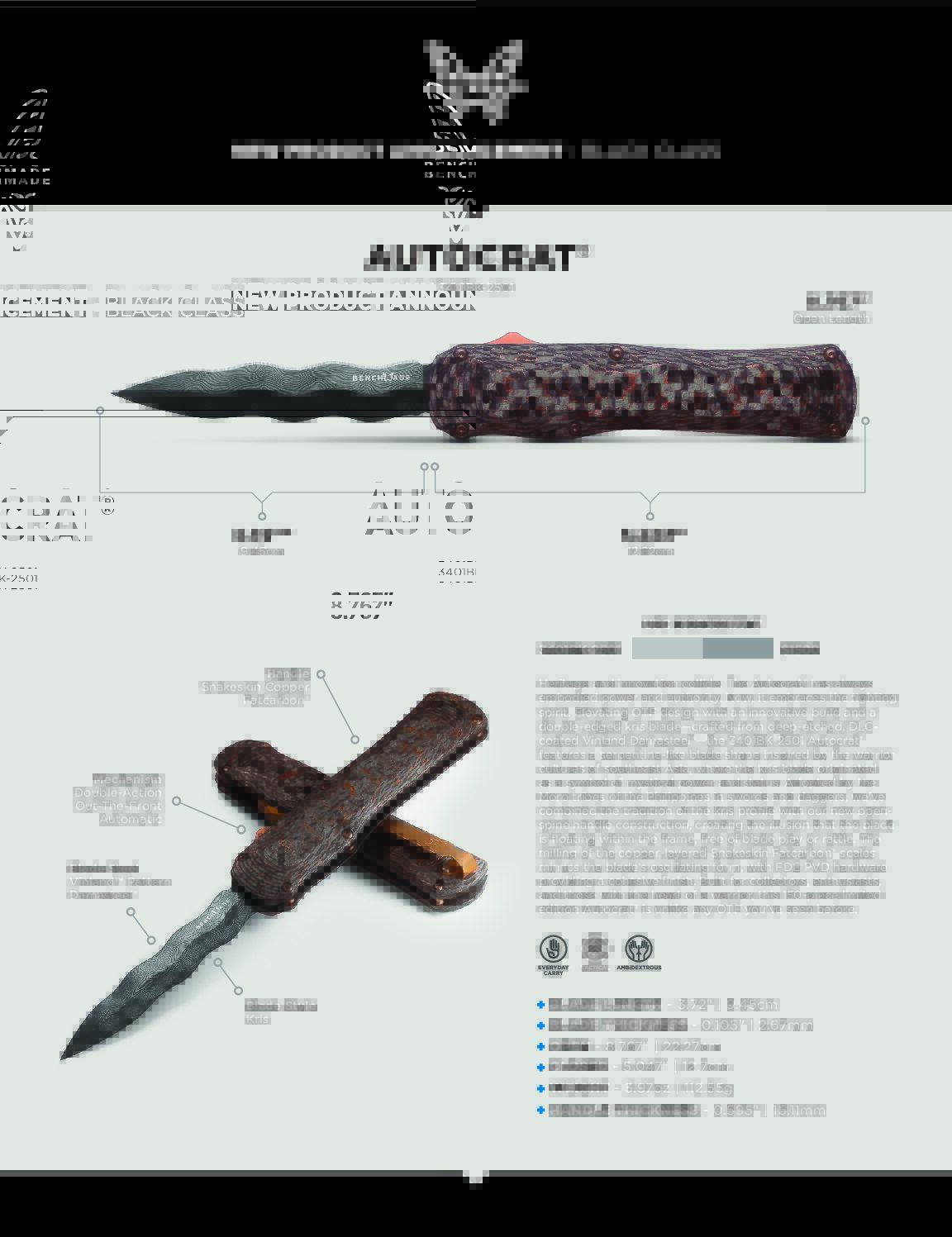 - “Heritage and innovation collide. The Autocrat® has always embodied power and authority. Now, it embraces the fighting spirit. Elevating OTF design with an innovative build and a double-edged kris blade—crafted from deep-etched, DLC-coated Vinland Damasteel®—the 3401BK-2501 Autocrat® features a serpentine-like blade shape inspired by the warrior cultures of southeast Asia, where the kris blade originated as a symbol of mystical power and status. Adopted by the Moro tribes of the Philippines in swords and daggers, we’ve combined the tradition of the kris profile with our new open-spine handle construction, creating the illusion that the blade is floating within the frame, free of blade play or rattle. The milling of the copper-layered Snakeskin Fatcarbon® scales mimics the blade’s oscillating form, with FDE PVD hardware providing a cohesive finish. Built for collectors, enthusiasts, and those with the heart of a warrior, this 150-piece limited edition Autocrat® is unlike any OTF you’ve seen before.” -BKC
