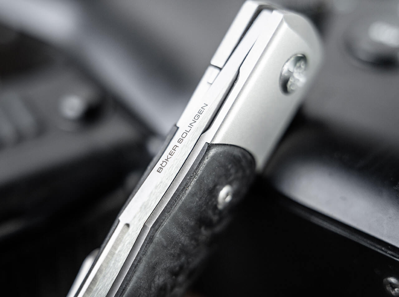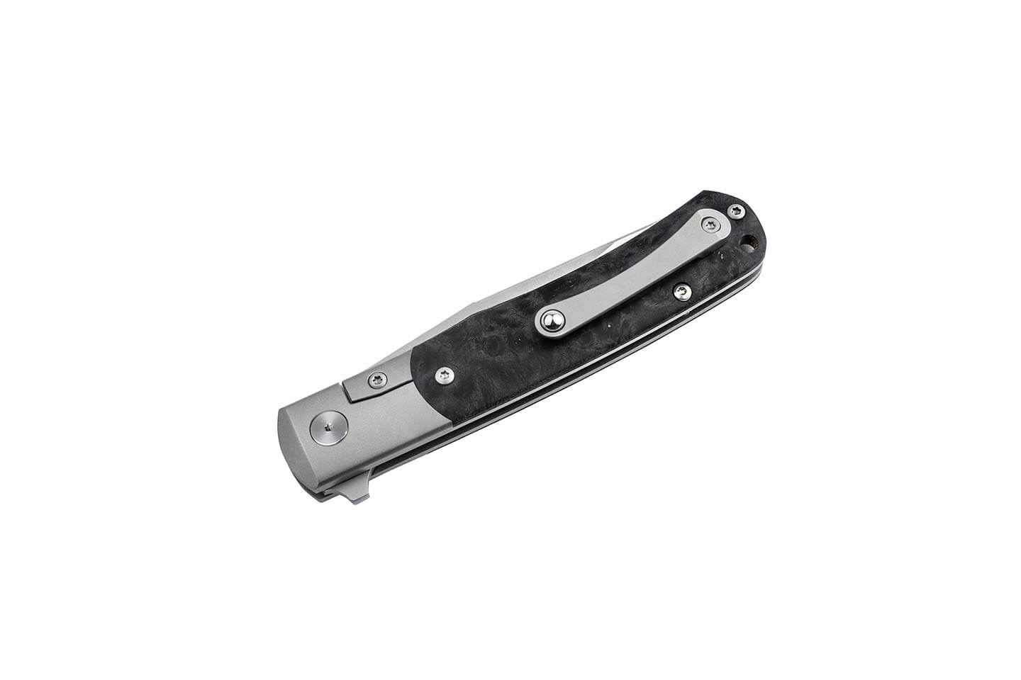 - “Discreet in name – sovereign in appearance. The Boker TRPPR (pronounced : Trapper) is an extraordinary gentleman’s knife that takes the spirit of the successful Boker Trapper into a new era. Although reduced to the essentials, the pocket-knife leaves nothing to be desired. The ball-bearing blade made of powder metallurgy MagnaCut (62-63 HRC) opens silky-smooth via a flipper, while the elegant integral framelock with stainless steel inlay and overtravel stop reliably secures the knife. The blade steel used is characterised above all by its high wear resistance, high toughness and high corrosion resistance and is rounded off by an attractive two-tone finish.The long bolster of the titanium handle reinterprets the nostalgic spirit of the times and shapes the TRPPR with its handle scales made of stabilised black Amboina wood with its unique grain into a new model of contemporary knife culture. Decorative accents are set by the front blade axle screw, which features the famous Boker tree mark, and the titanium clip (tip-up/r) milled from the solid with a ball. To protect it from dirt and scratches, the Boker TRPPR comes in a high-quality felt pouch. Handmade in the Boker Manufactory in Solingen.”